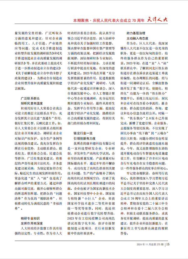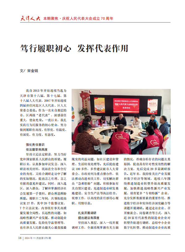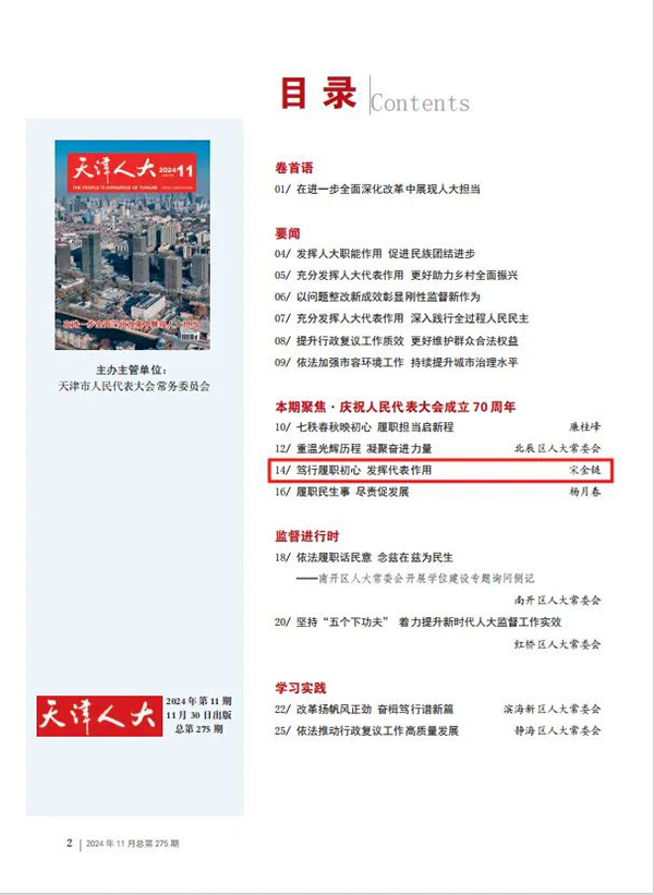 《天津人大》雜志2024年第11期在聚焦·慶祝人民代表大會成立70周年欄目中刊發(fā)康科德公司總經理、市人大代表宋金鏈文章《篤行履職初心 發(fā)揮代表作用》。全文如下: