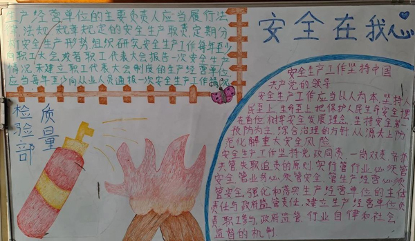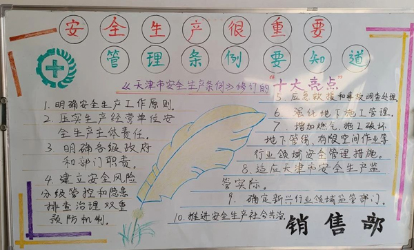 為了讓每一位員工都能深刻理解并踐行天津市安全生產(chǎn)條例,公司組織了一場全員參與的學(xué)習(xí)盛宴。各部門積極響應(yīng),以部門為單位,精心編寫了“天津市安全生產(chǎn)條例”專題學(xué)習(xí)板報。這些板報不僅內(nèi)容豐富、圖文并茂,更是成為了大家交流學(xué)習(xí)心得、分享安全知識的重要陣地。