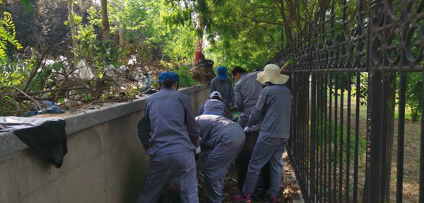 早上八時(shí)許,伴隨著夏日清晨溫暖的陽(yáng)光,著裝整齊的十三名同志按照預(yù)定的方案開始清理工作,有序分工,團(tuán)結(jié)互助。他們有的用锨鏟,有的用手抓;有的用鋸割,有的做清掃。隨著氣溫的上升,汗水浸濕了衣裳,塵土掛落在臉龐,大家激情不減,干的熱火朝天。隨著一袋袋的枯葉、一車車的垃圾、一捆捆的殘枝被清運(yùn)出去,整潔干凈的隔離帶逐漸顯露出來(lái)。