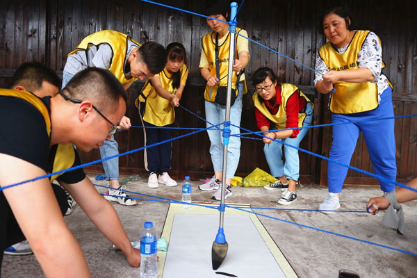 “共書未來”活動中,各隊成員同執(zhí)一支筆,把此次的收獲融合企業(yè)文化總結(jié)成了四字成語共同書寫在四尺紙卷上。
